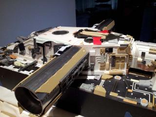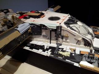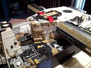 Been playing a bit more on this area. Glued down the parts that i had only tacked down previously because of needing final placement once the cross arm detail went on. Then went ahead and added the chips along with the rest of the piping bar a couple that will be left until i work out what plane fuselage i will go with in the end for the bottom of the cross arms. A couple more parts were added and now theres really only a few left unkown for this section now that so far are eluding me. Will be hunting a bit more again tonight for those so until they are found this is pretty much as far as i am going with this again. One side is pretty much complete now and although things don't look quiet right they still look good enough for me.